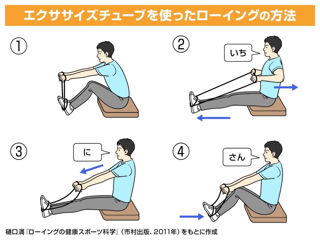 ゴム状のチューブの伸縮性を利用して負荷をかけて行う「チューブトレーニング」のローイング版ともいえます。