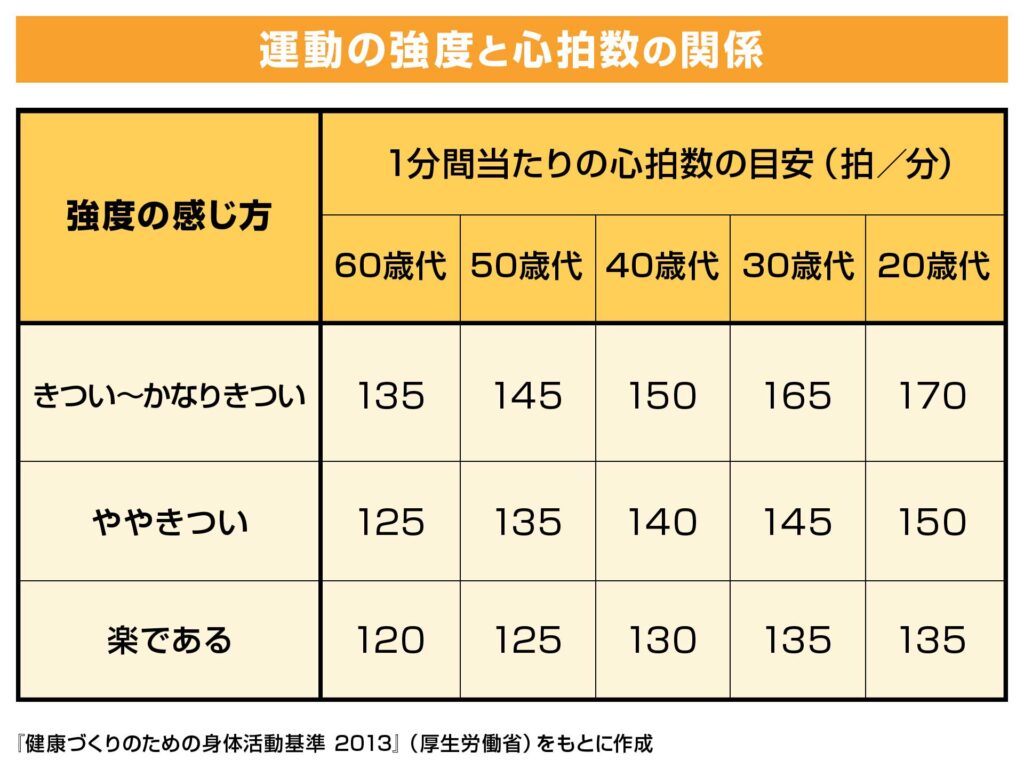 運動強度と心拍数との関係は、上の表で分かります。強度の感じ方を「きつい~かなりきつい」「ややきつい」「楽である」の3つに分け、年代別に1分間当たりの心拍数の目安を示したものです。強度がオーバーしないように、ぜひこの表を活用してください。