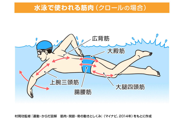 特にクロールでは、腕のかき(ストローク)によって上半身の上腕三頭筋や広背筋が、脚の蹴り(キック)によって大腿四頭筋、腸腰筋、大殿筋といった下半身の筋肉が使われ、全身の骨格筋がきたえられる有酸素運動です。