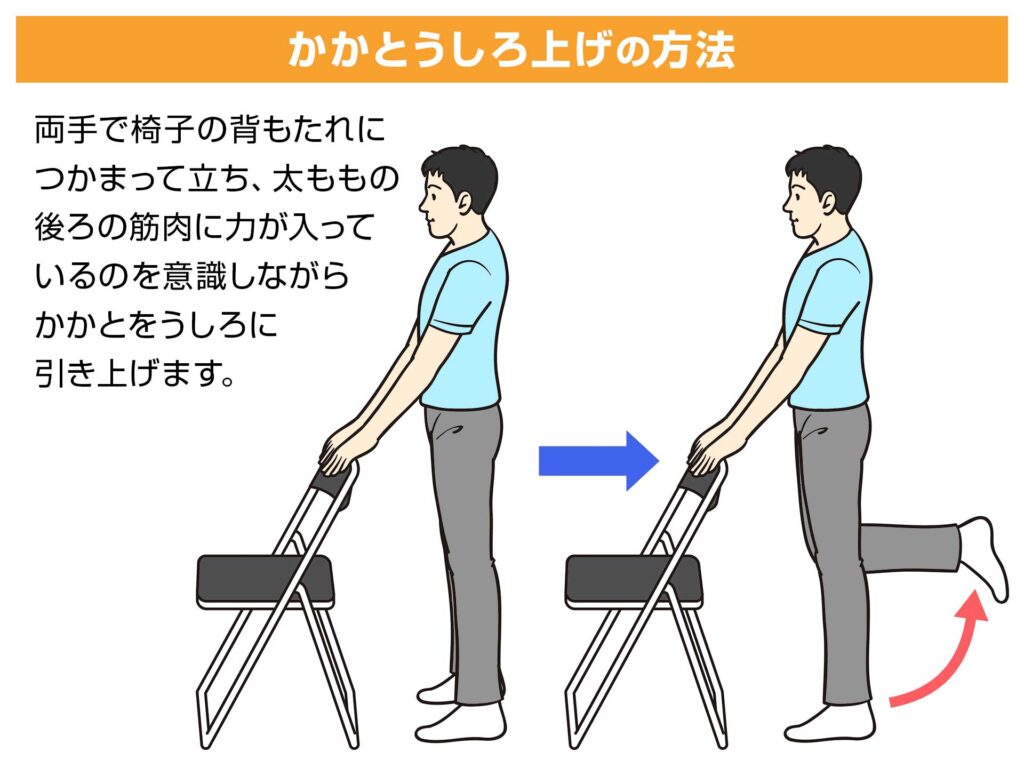 椅子の背もたれにつかまって立ったまま、かかとをうしろに引き上げる筋トレです。太もも後部の筋肉(ハムストリングス)をきたえます。