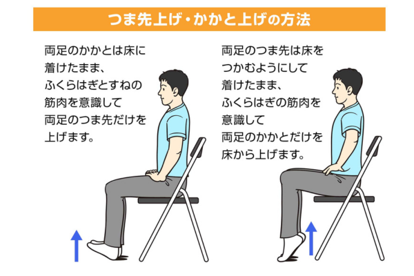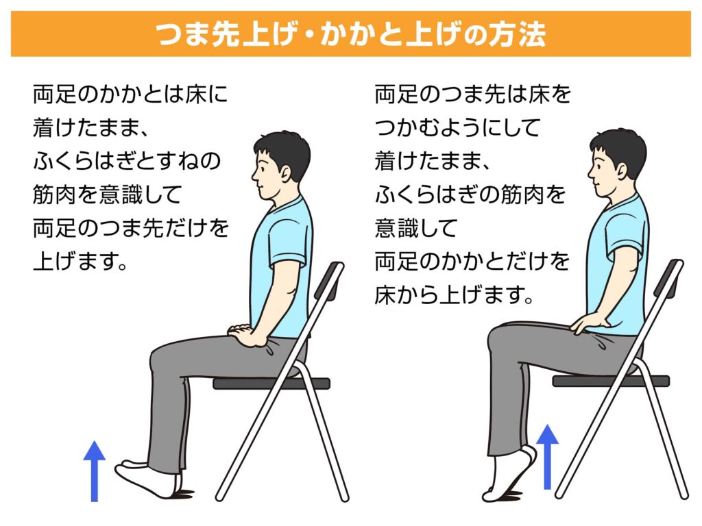 ②つまさき上げの場合=両足のかかとは床に着けたまま、両足のつま先だけを同時に床から上げます。このとき、ふくらはぎとすねの筋肉を使っていることを意識します。椅子に座っているとき、1セット10~30回を、できるだけ多く行います。