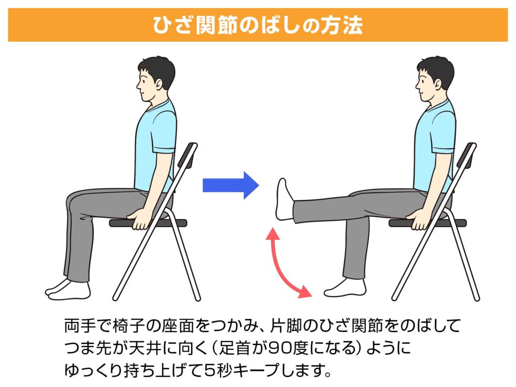 椅子に座ったまま、つま先が天井に向くようにひざ関節をのばし、そのまま5秒キープする筋トレで、太ももの前部の筋肉(大腿四頭筋)をきたえます。