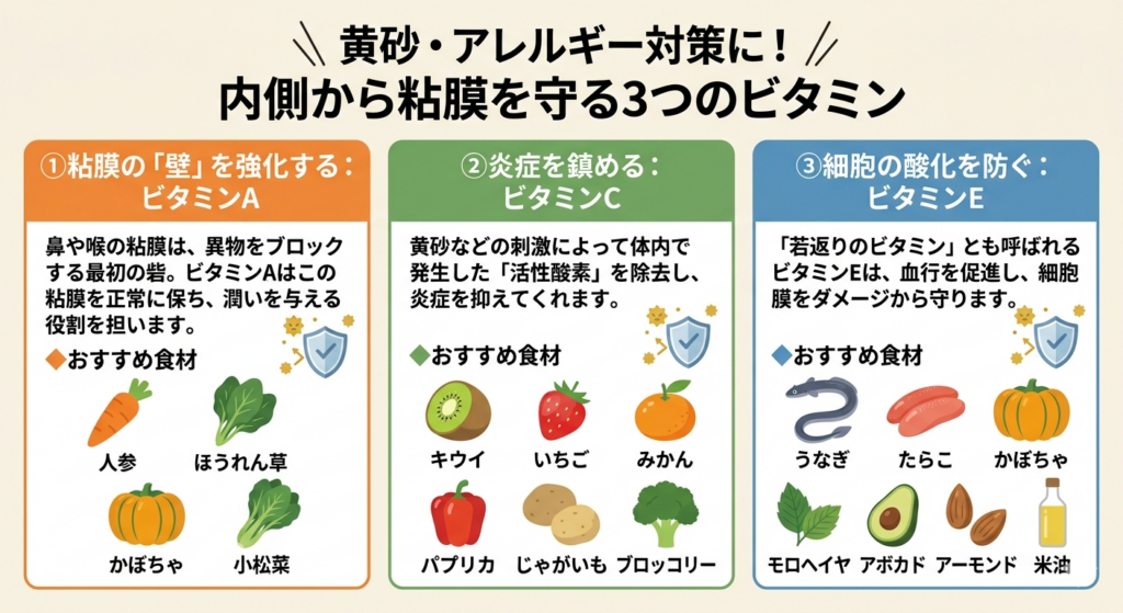 黄砂や花粉の侵入をゼロにすることはできません。「入ってきても負けない粘膜」の下地を作る食事のポイントを紹介します。