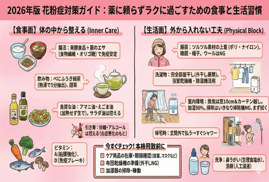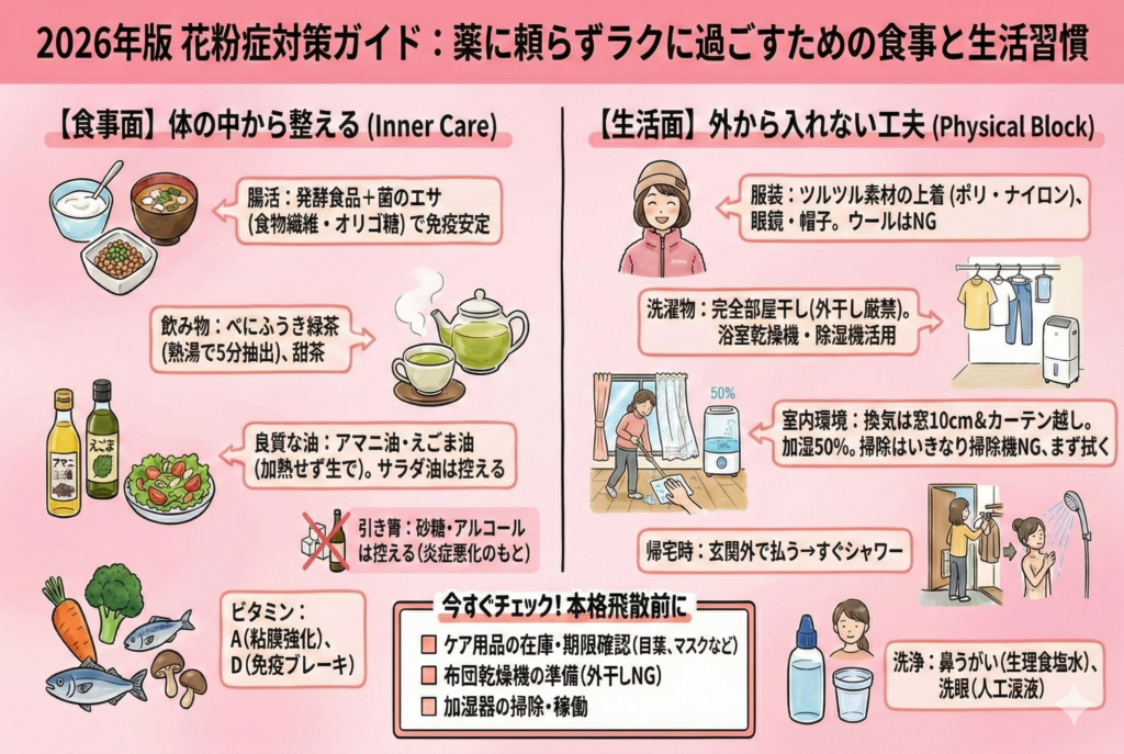 私たち40~50代の「大人女子」にとって、花粉症の症状は更年期の揺らぎと重なり、ダブルパンチで体力を削いできます。薬だけに頼らずラクに過ごすための「2026年版・実践ガイド」第1弾として、食事と生活スタイルをまとめました。