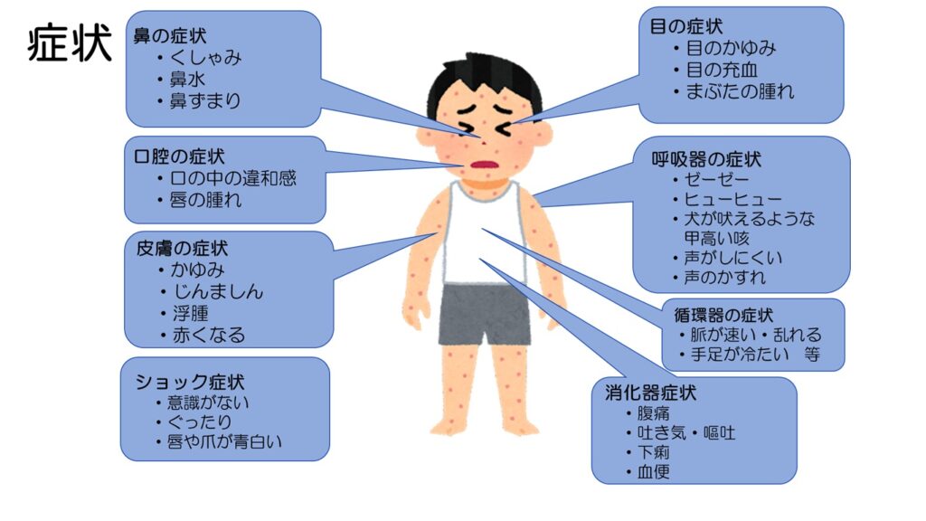 症状は皮膚症状が多く、他にも多彩な症状が同時もしくは別々に出てきます。症状の出現については、個人差があります。(食物アレルギーと思われる症状が出た場合には、原因食物を食べたおおよその時間や症状の出た時間、症状についてメモしておくことをお勧めします。医療機関で説明する時に便利です。)