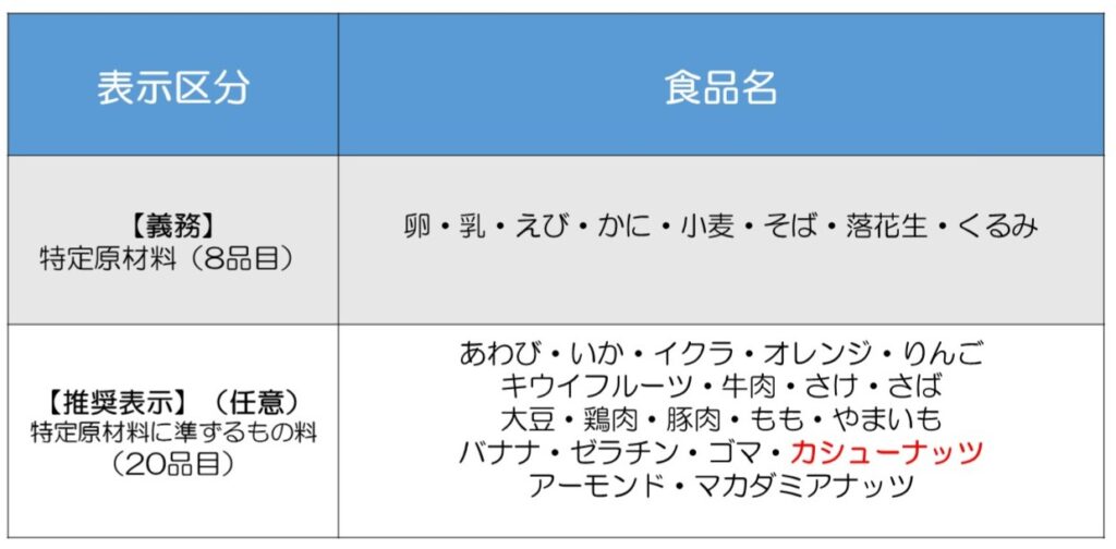 赤字のカシューナッツは、令和7年度中に義務表示の食物に入る予定です。今後のニュースに注目しておきましょう。