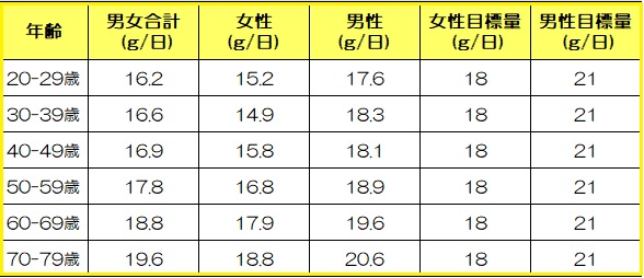 令和6年の国民健康・栄養調査の結果は下記の通りです。女性の目標は1日18g以上ですが、多くの方が不足しているのが現状です。