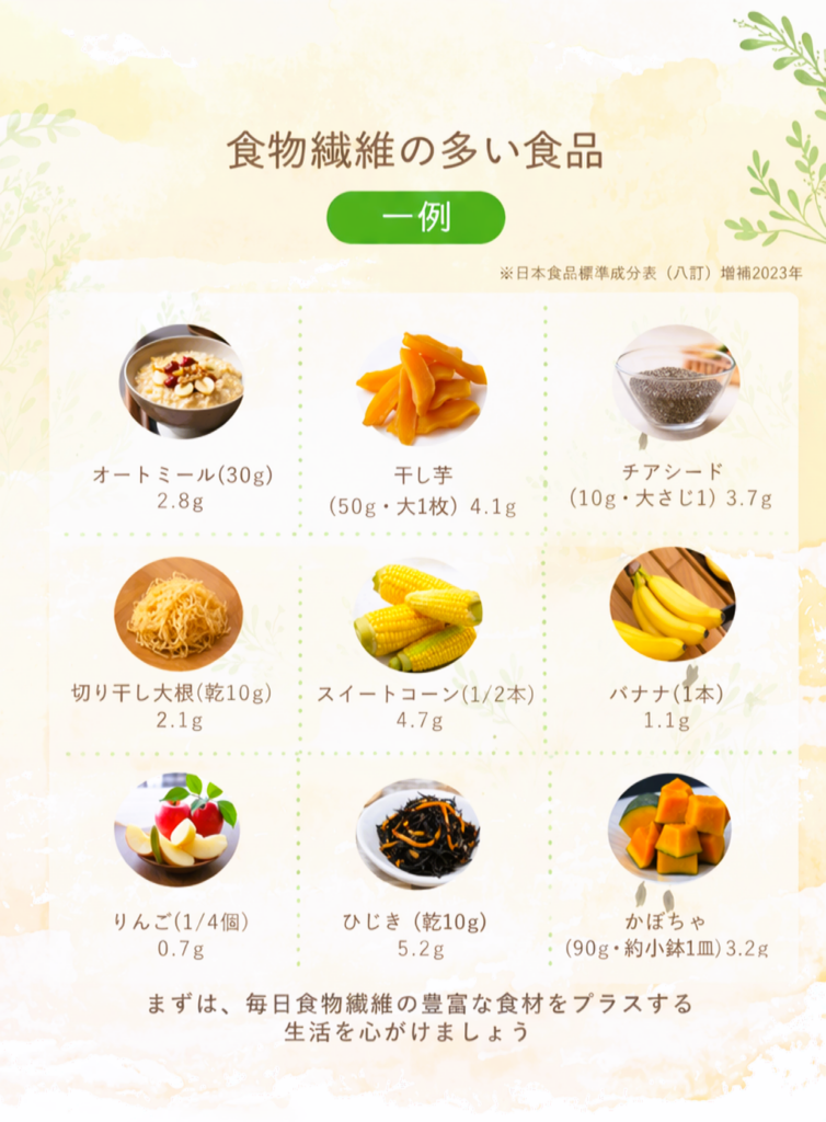 このように「いつもの食事に足す」だけで、自然と食物繊維の量は増えていきます。