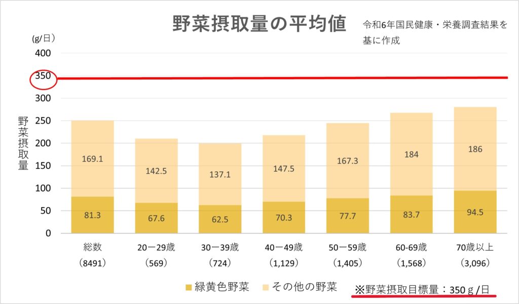 また、食物繊維が多く含まれる野菜摂取量についても国民健康・栄養調査の結果では、目標量を大幅に下回っていました。1日の摂取目標量350gに対し、野菜摂取量の平均値は258.7gでした。