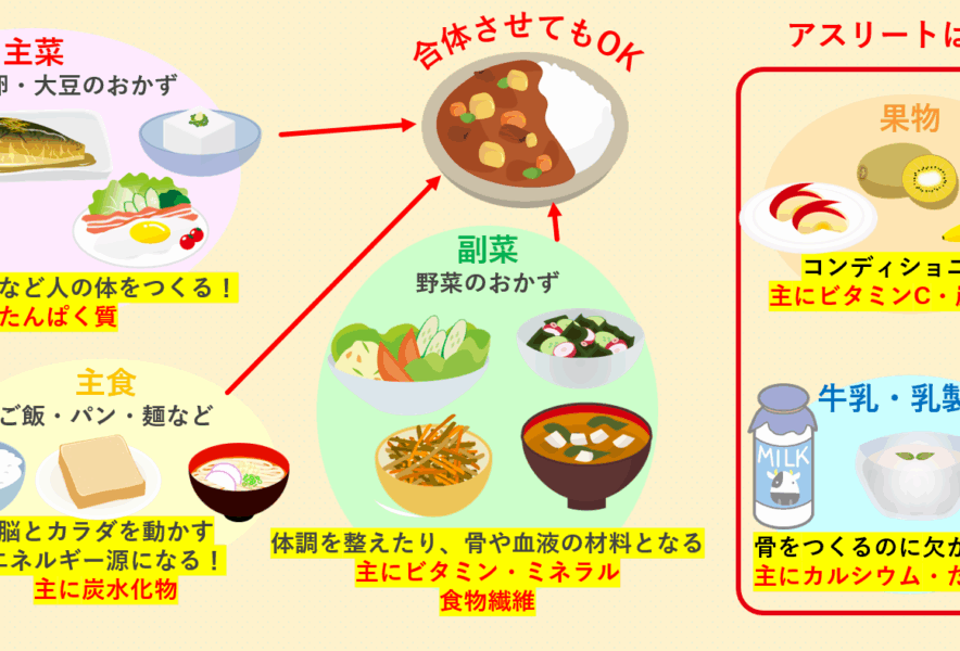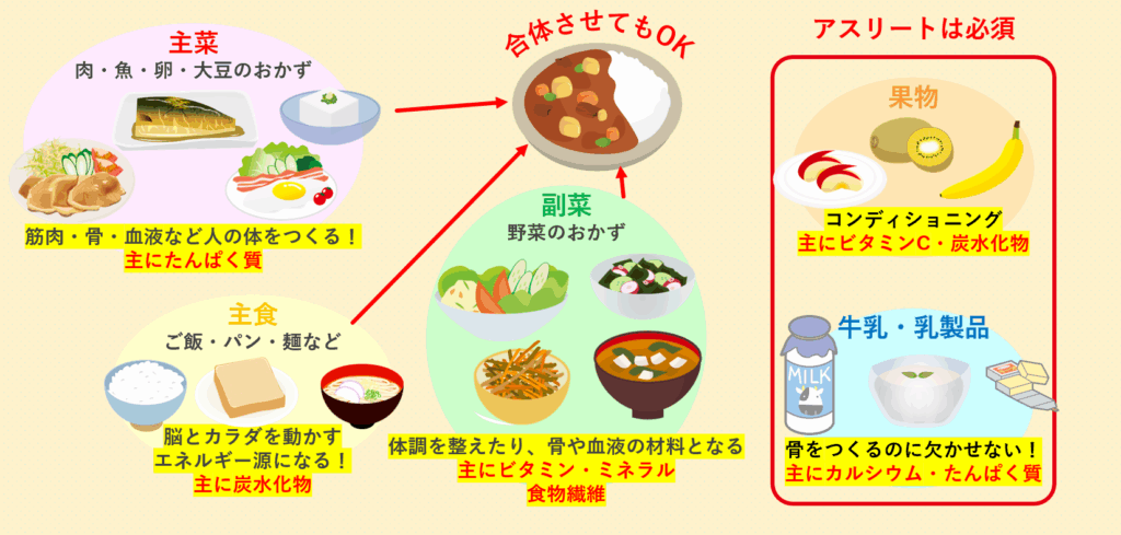 2.スポーツ栄養の基本は「主食・主菜・副菜」に果物と牛乳・乳製品
