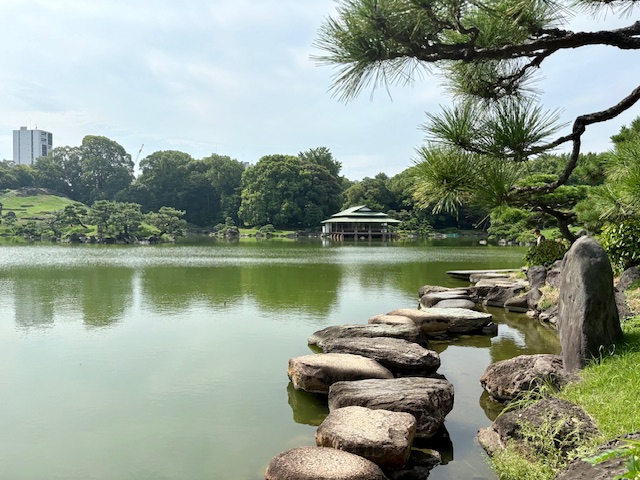 「大泉水」の周りには、全国から取り寄せた伊予青石、佐渡赤玉石、備中御影石などの貴重な名石を随所に配し、富士さんなどを模した築山が配されています。特徴的なのは、池の周囲3カ所にある「磯渡り」。池の端に点々と置かれた石を伝いながら、より水辺を感じることができます。