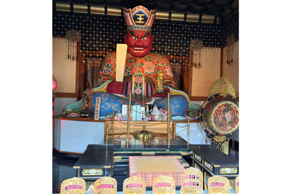 続いて約1キロ先、江戸時代から「深川の閻魔さん」と親しまれてきた法乗院へ。近年復興した閻魔様は、高さ3.5メートル、幅4.5メートルの巨大な座像で、真っ赤なお顔でにらみを利かせています。。