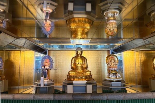 本堂1階には地獄絵(千葉県南房総市の延命寺所蔵の地獄極楽絵図)の複製が16幅、ずらりと並んでいます。奥の中央には、金色の「釈迦如来坐像」、向かって左には紫の羽根を拡げている彩色豊かな「大孔雀明王」、右手には象に乗る「延命普賢菩薩」。左右と天井に鏡が設置されているので、逆さ富士ならぬ「逆さ仏像」が見ることができる特殊な空間です。上からも左右からも仏様を見ることができるので、御利益が高まりそうです。