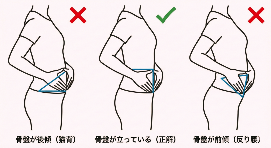 下腹部に適度な腹圧は必要ですが、無理に力を込める必要はありません。自分の骨盤が後傾、もしくは前傾だと感じたら、この三角形の角度を調整してみてください。太ももの前側の張りがふっと抜け、ストンと楽に立てる位置が見つかるはずです。