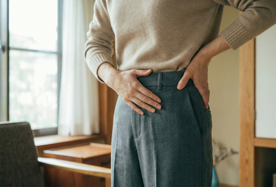- そのまま、手のひらの下半分(手首に近い部分)を、腰の両サイドにある硬い骨の出っ張り(上前腸骨棘、ASIS)に当てます。