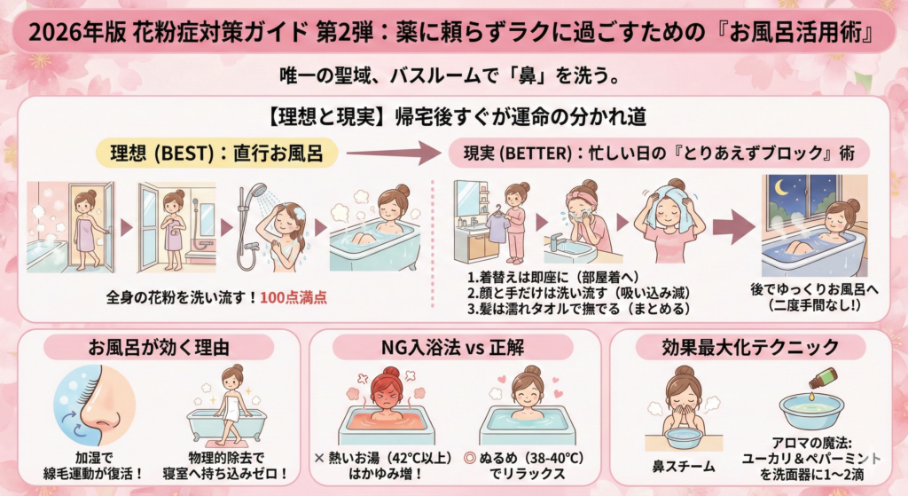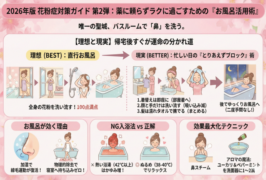 お風呂は単に体の汚れを落とすだけでなく、花粉症の症状を劇的に和らげる「治療室」にもなり得ます。2026年版花粉症対策ガイド第1弾の「食事と生活習慣」に続き、第2弾は「お風呂活用術」をお伝えします。