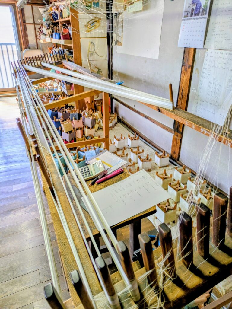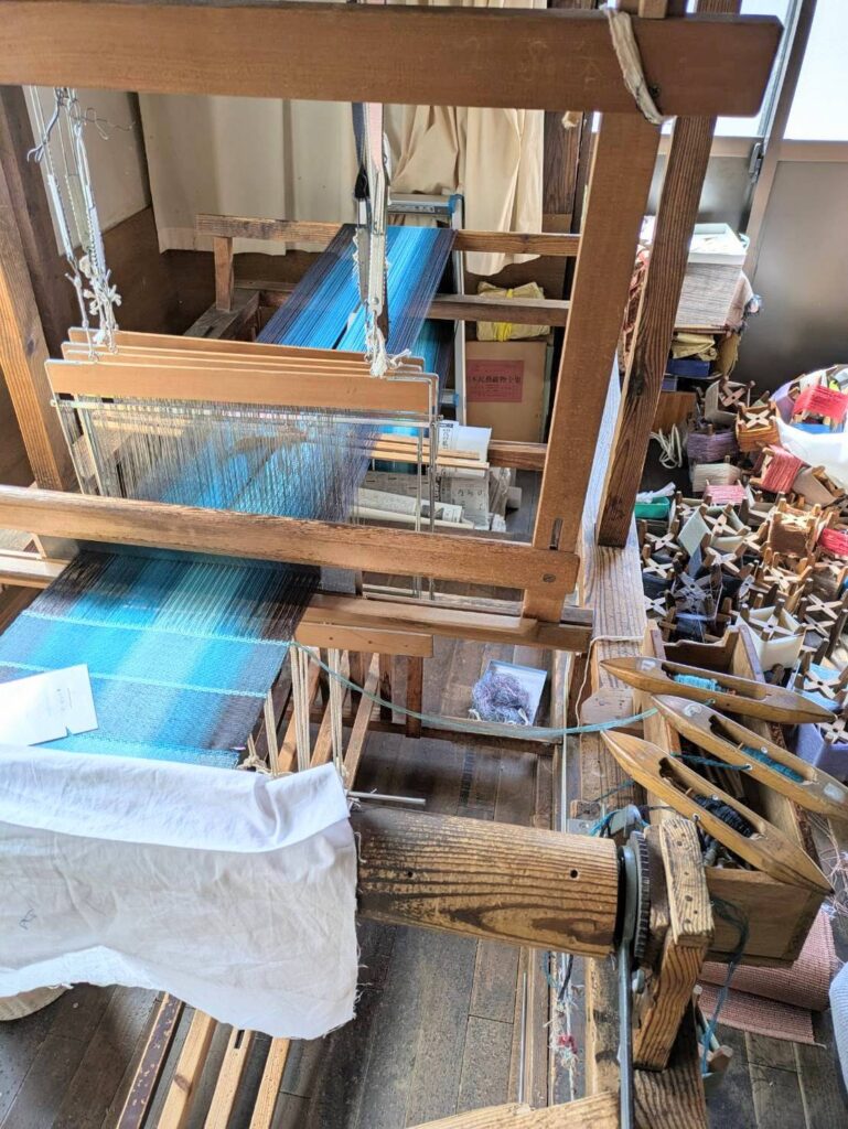 所狭しと織り機が並び、作業途中のものもあります。