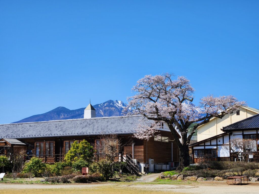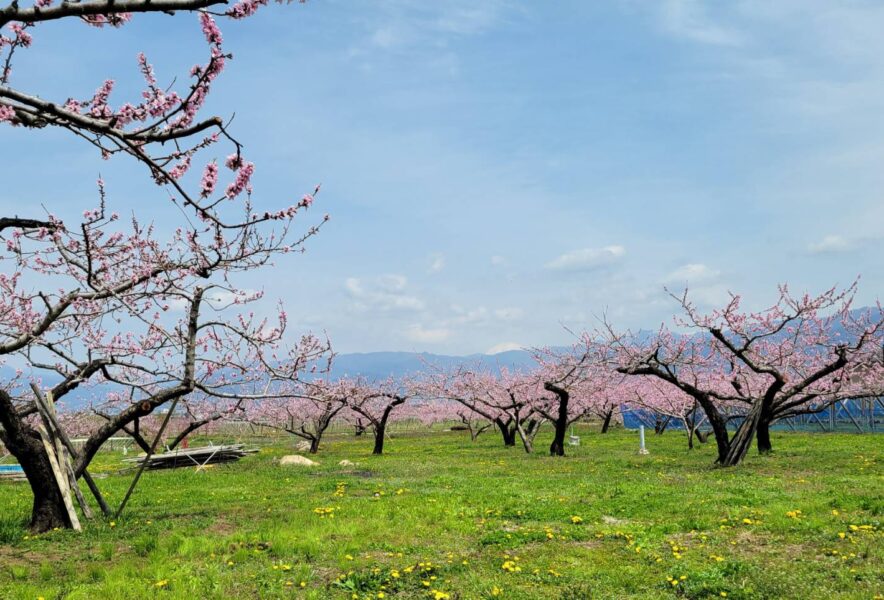 富士山や南アルプス、八ヶ岳を背景に舞う花びらもまた、この時期ならではの景色です。
